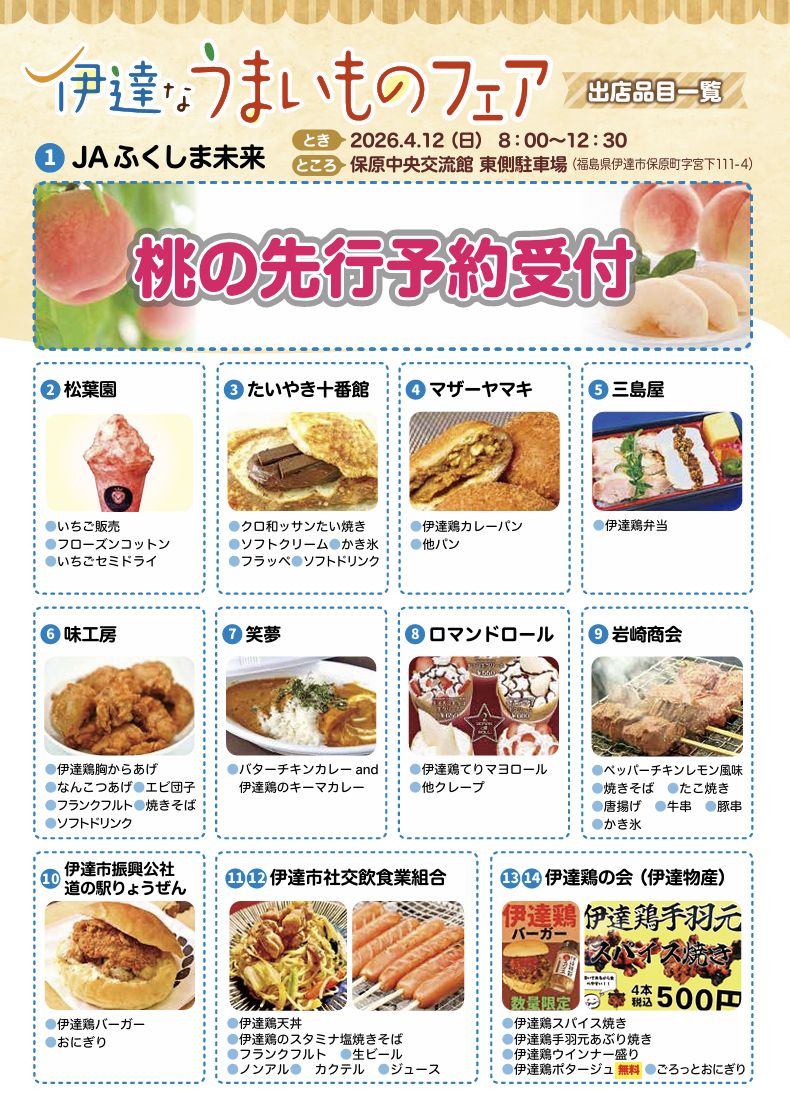今週末(4月12日 日曜日)に開催される「伊達ももの里マラソン大会」に合わせ、保原中央交流館東側駐車場(チンチン電車駐車場)にて「伊達なうまいものフェア」が開催されます。伊達市特産の「伊達鶏(だてどり)」を使ったグルメやスイーツなどが盛りだくさん。