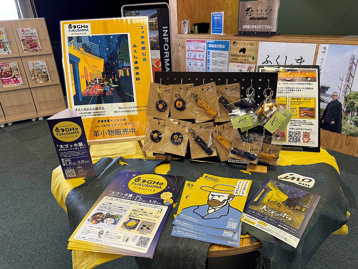 またゴッホ展にちなんで「inoDATE(イーノダテ)」ブランドの「夜のカフェテラス」をイメージした青と黄色の猪革製品のキーホルダーや小物(ゴッホさん、ひまわりなど)も販売しています。