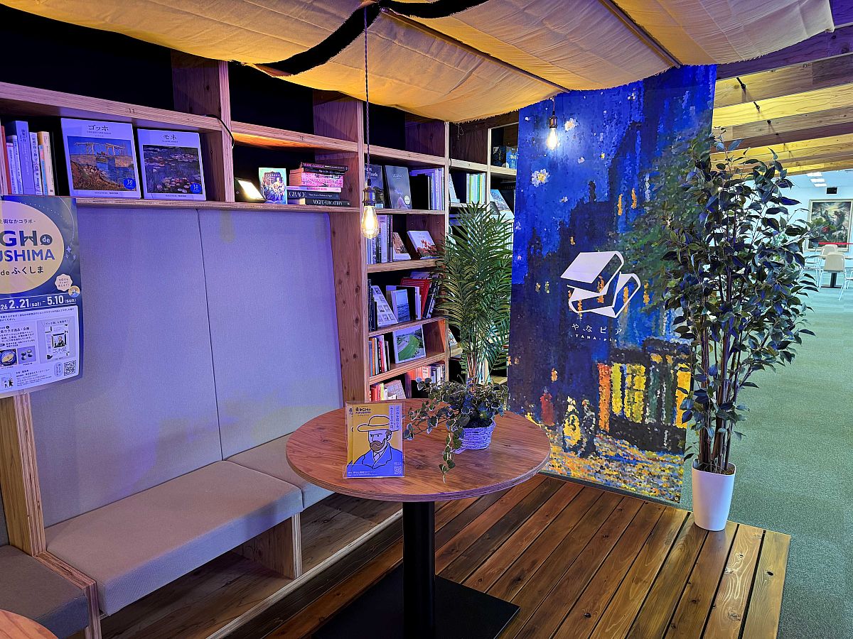 自由にくつろぎ、読書📖、学習🖊、交流できる施設「やなピア」。ただいま絶賛開催中の「大ゴッホ展」コラボ企画として「やなピア」の一角を「夜のカフェテラス」風に演出し、ちょっとしたフォトスポットにしちゃいました。