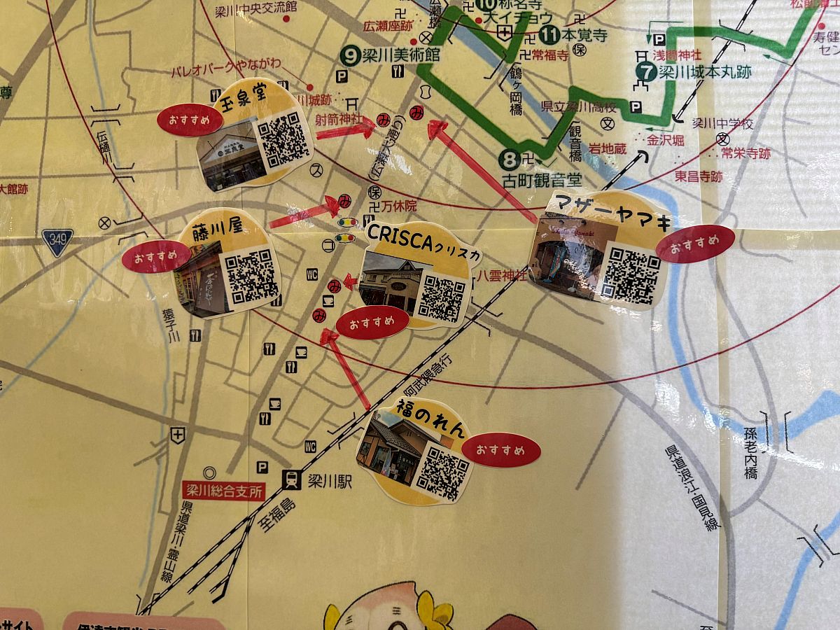えっ、お菓子を持って来てないって?安心してください。「やなピア」のある梁川町には美味しいお菓子屋さんがたくさんあり、美味しいケーキや焼き菓子などの洋菓子、お饅頭やお団子などの和菓子のお店が「やなピア」前の道路沿いに並んでいます。そしてなんと親切なことに「やなピア」内にGoogle Mapに繋がるQRコード付き「お菓子屋さんマップ」が掲示されており、下の観光案内所で「レンタサイクル🚲」を借りればお菓子屋さんに直ぐに行けちゃいます。