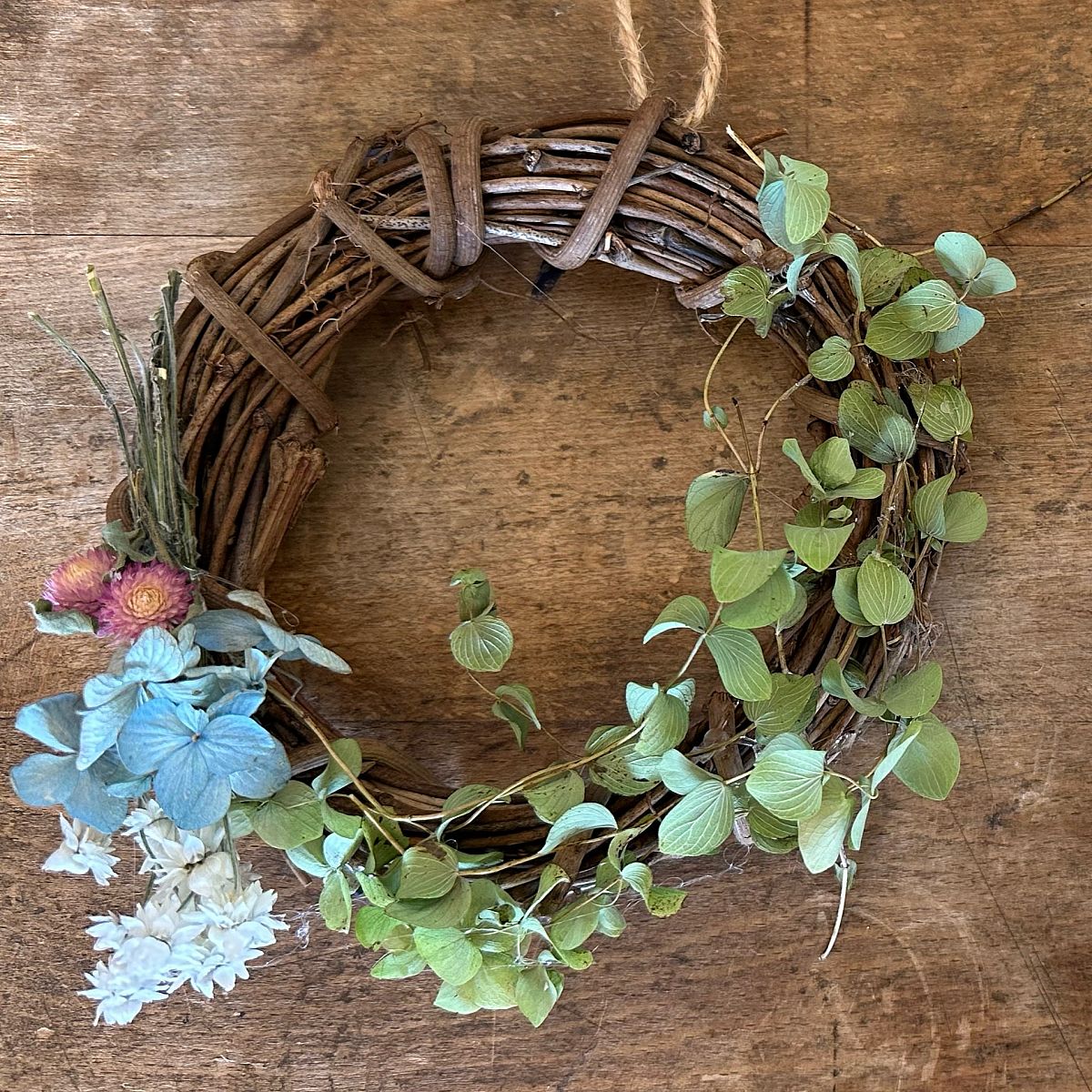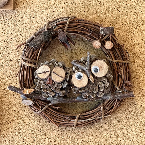 直径約13㎝のリースに花工房で育てたドライフラワーや、松ぼっくりで作ったふくろうを貼り付けて素敵な作品作り