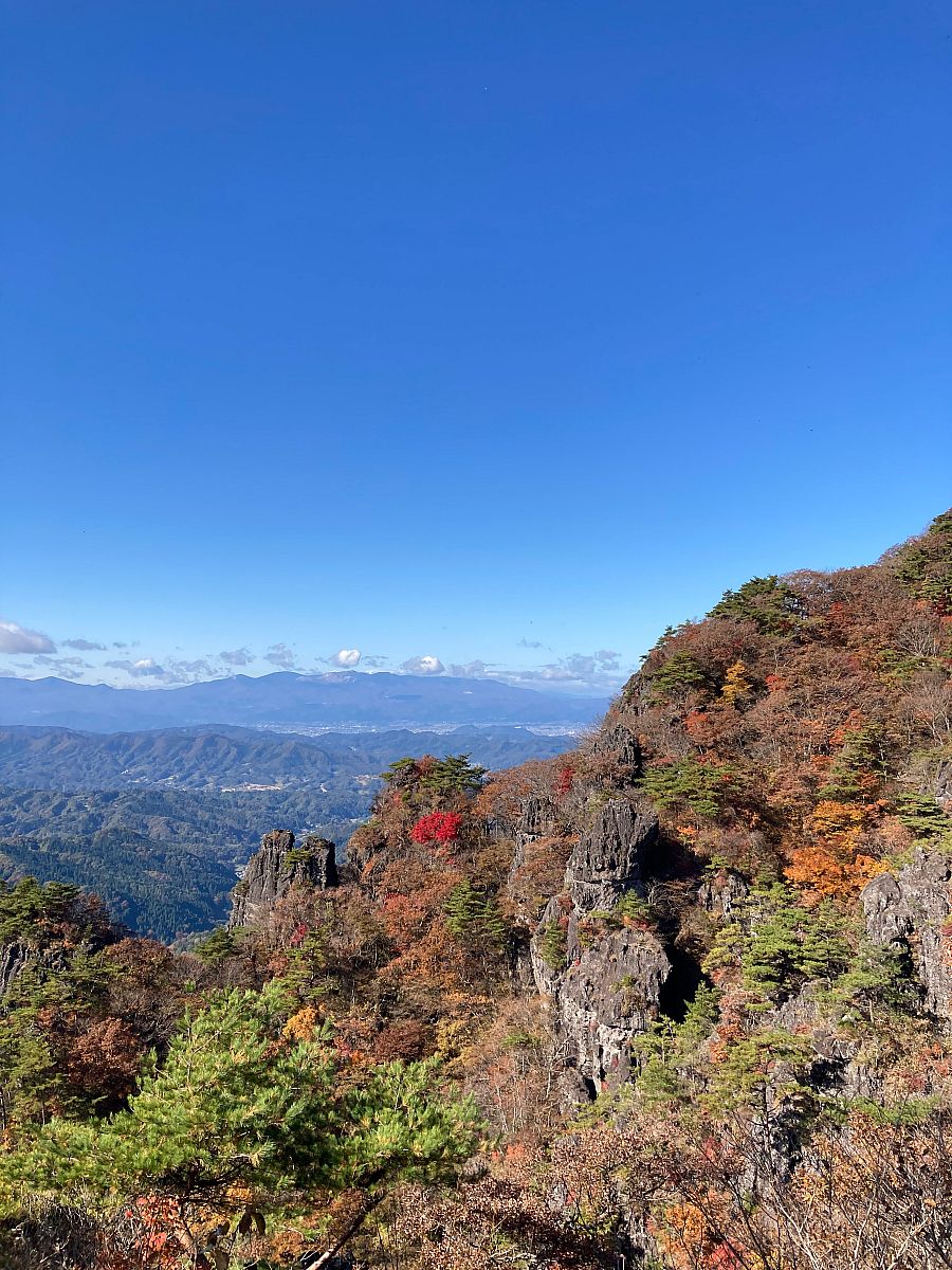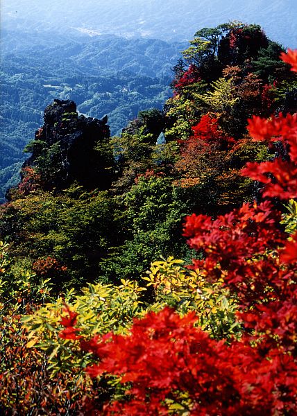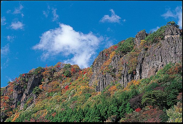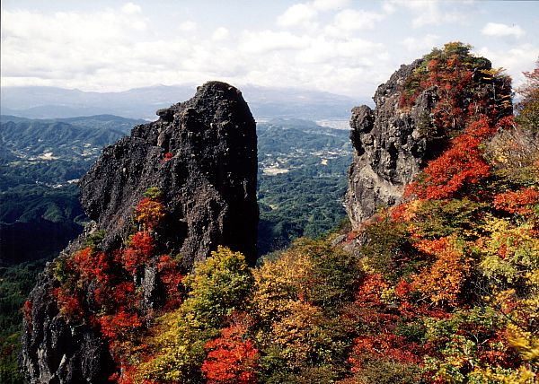 阿武隈山系のゆるやかな稜線の中にそそり立つ奇岩怪石は、ひときわ威容を誇り、春の新緑、山ツツジの花開く5月下旬、そして10月中旬~11月初旬の紅葉は目を見張る美しさとなります。特に紅葉のころ、岩肌に赤や黄色の色彩がちりばめられたさまは、錦絵を思わせます。