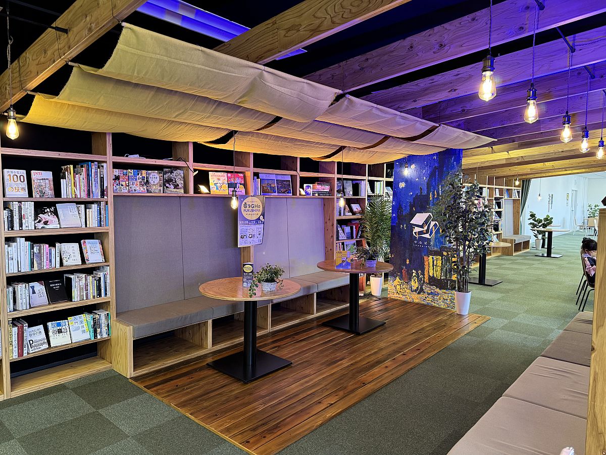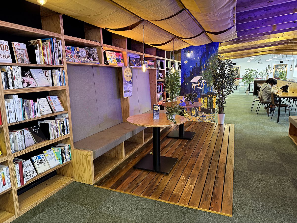 自由にくつろぎ、読書、学習、交流できる施設「やなピア」。今回の大ゴッホ展開催期間中、コラボ企画として「やなピア」の一角を「夜のカフェテラス」風に演出し、ちょっとしたフォトスポットにしています。カフェテラス風演出を見てお茶したい気分になっちゃうかも・・・。