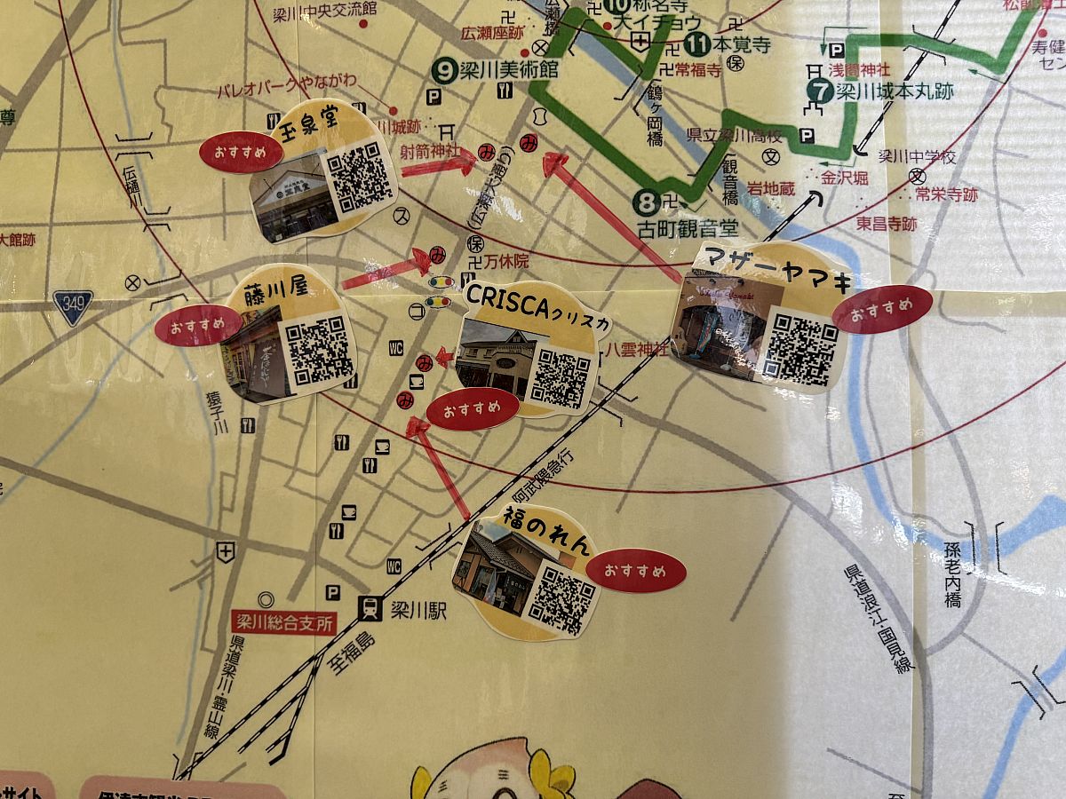 そんな気分になっても安心。「やなピア」のある梁川町には美味しいお菓子屋さんがたくさん。美味しいケーキや焼き菓子などの洋菓子、お饅頭やお団子などの和菓子が「やなピア」前の道路沿いに並んでいます。やなピア内にはGoogle Mapに繋がるQRコード付きお菓子屋さんマップが掲示されており、下の観光案内所で「レンタサイクル」を借りればお菓子屋さんにも直ぐに行けちゃいます。