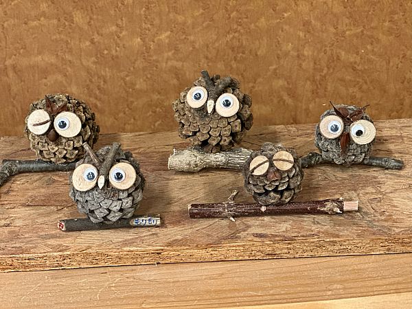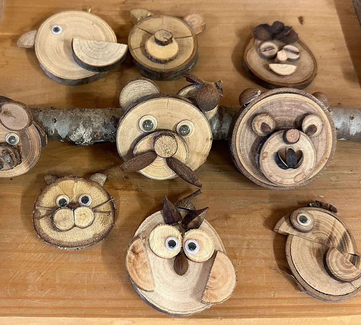 輪切りになった木に、木の実を貼って動物などを作成