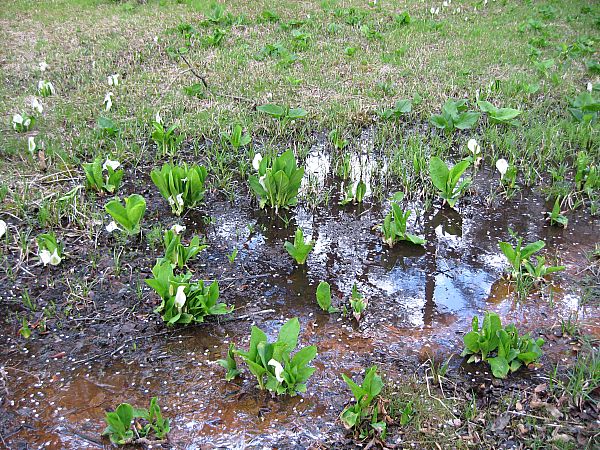 湿性植物園では、お林沼につづく湿地帯を改修したもので、ミズバショウ、その仲間のザゼンソウ、蓮の花などが植えられています。