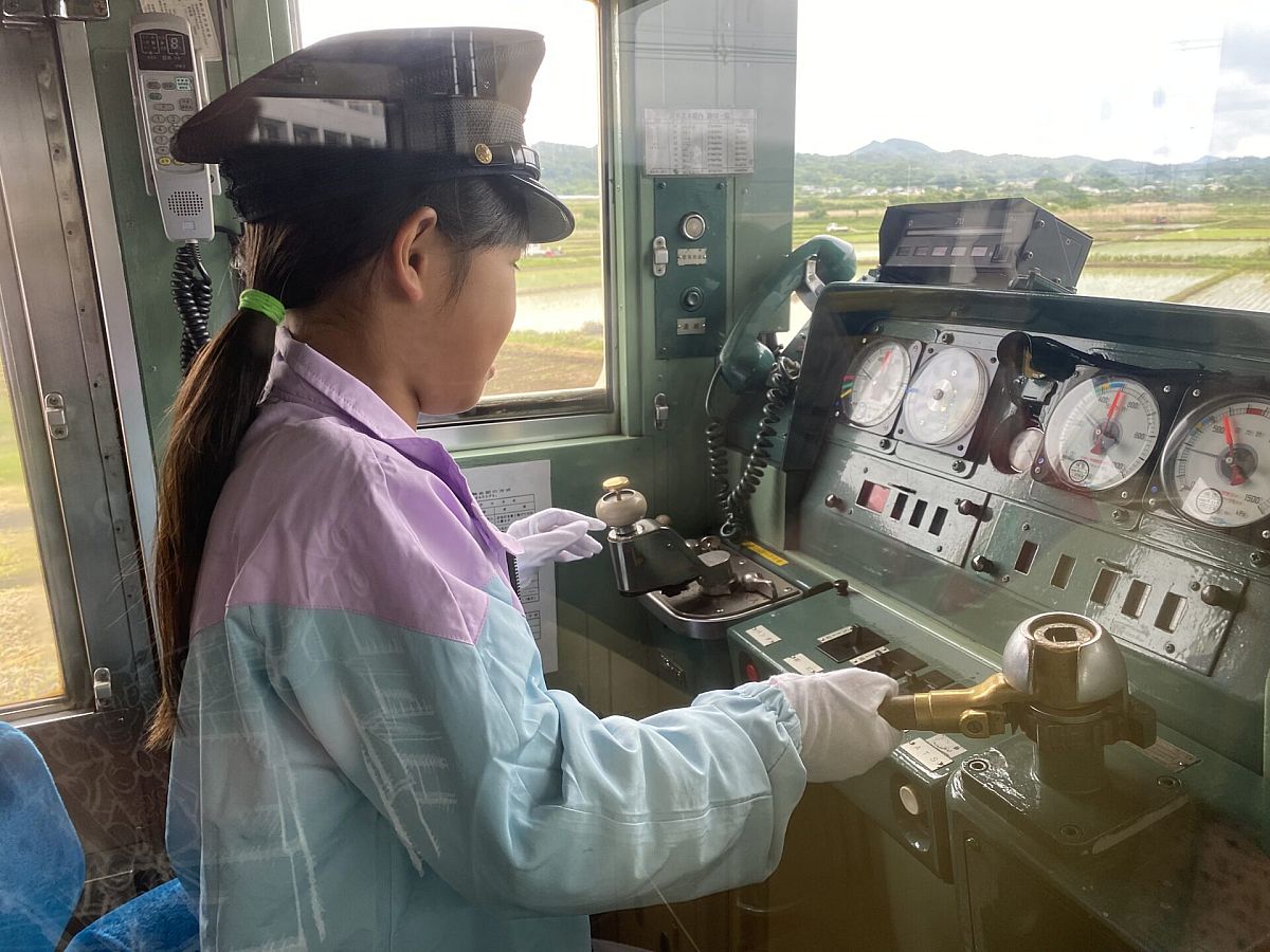 梁川車両基地構内で制帽を着用し、運転士になりきって阿武隈急行の車両で運転体験をすることができます。