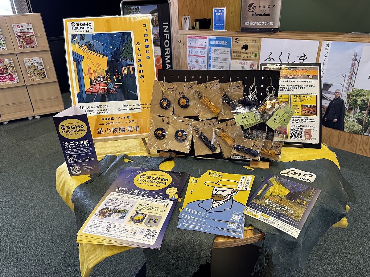 大ゴッホ展期間中は是非とも「やなピア」の「夜のカフェテラス」へお越しいただき、梁川町の美味しいお菓子を食べに来て下さい。inoDATE(イーノダテ)ブランドの「夜のカフェテラス」をイメージした青と黄色の猪革製品のキーホルダーや小物(ゴッホさん、ひまわりなど)も販売しています。