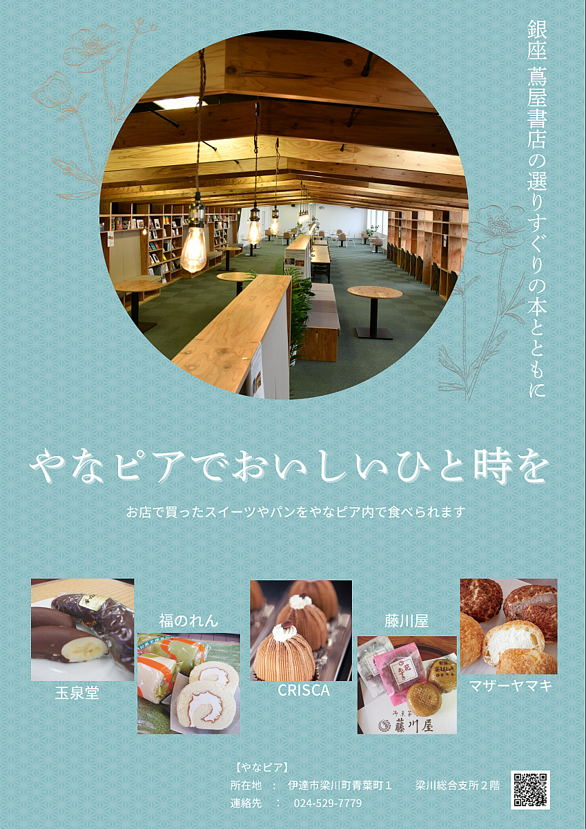 そんな気分になっても安心。「やなピア」のある梁川町には美味しいお菓子屋さんがたくさん。美味しいケーキや焼き菓子などの洋菓子、お饅頭やお団子などの和菓子が「やなピア」前の道路沿いに並んでいます。やなピア内にはGoogle Mapに繋がるQRコード付きお菓子屋さんマップが掲示されており、下の観光案内所で「レンタサイクル」を借りればお菓子屋さんにも直ぐに行けちゃいます。